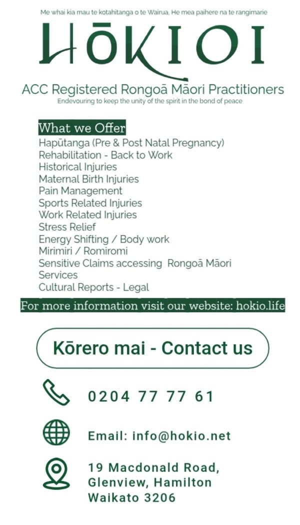 Hokioi provides Rongoā Māori healing and rehabilitation services for individuals recovering from sports injuries, workplace accidents, and other physical or emotional challenges. Our holistic approach draws on traditional Māori healing practices such as mirimiri, romiromi, rongoā rākau, karakia, and kōrero to support recovery and restore balance to the body, mind, and wairua (spirit). We also operate as an Employee Assistance Programme (EAP) service provider, offering Rongoā Māori sessions through employer wellbeing initiatives—ensuring cultural, spiritual, and physical support in the workplace. Our Rongoā Māori services can be accessed directly or through leading EAP networks including Clearhead, Tellus, and Vitae, making it easier for individuals and organisations to integrate traditional healing into modern health and wellbeing pathways.